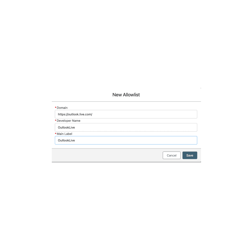It's crucial to ensure that the domain you intend to log in from is listed. If, for instance, the domain https://outlook.live.com/ is not present, you'll need to add it manually. Click on "NEW," input the domain URL https://outlook.live.com/ in the Domain field, provide the Developer Name and Mail Label, and then click "SAVE." This step ensures a seamless connection between your Outlook and Salesforce accounts.